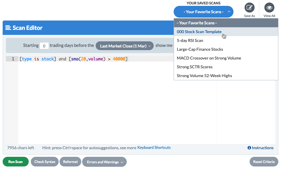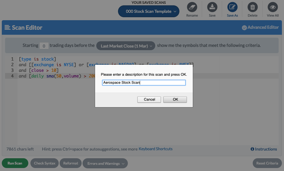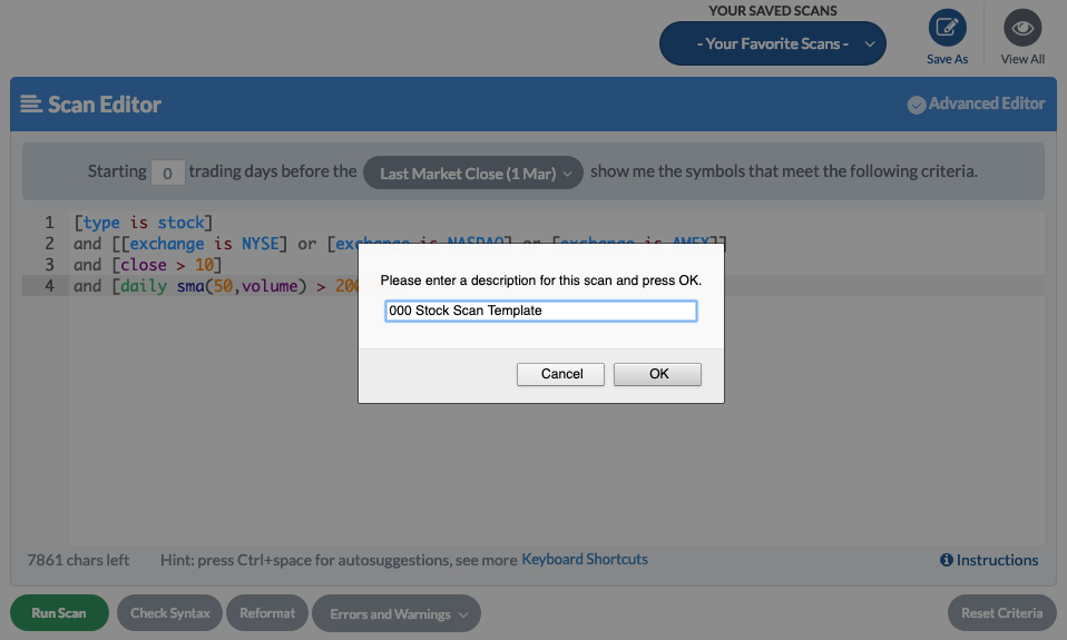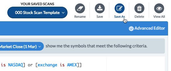 Did you know you can add more than one template? Perhaps, in addition to the stock scan template created above, you'd like to create one with your standard criteria for scanning ETFs. To do so, just add that criteria to a new scan and save it with a descriptive name, such as “001 ETF Scan Template.”