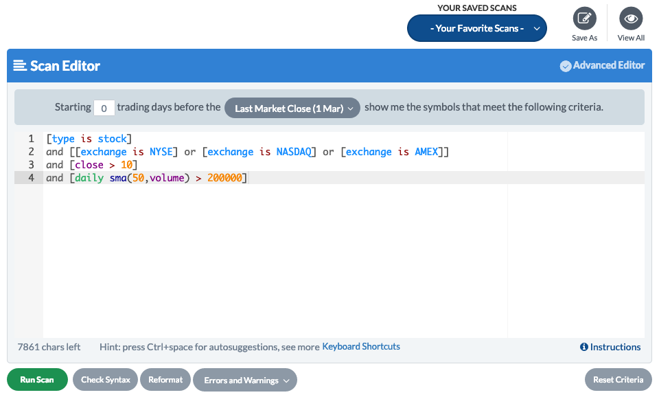This is a pretty broad guideline, one that may include stocks that you would not normally be interested in, such as relatively thinly traded stocks, penny stocks, foreign stocks, and/or ETFs. Most people use a set of universe-defining criteria on almost all scans. Yours may be something like this: