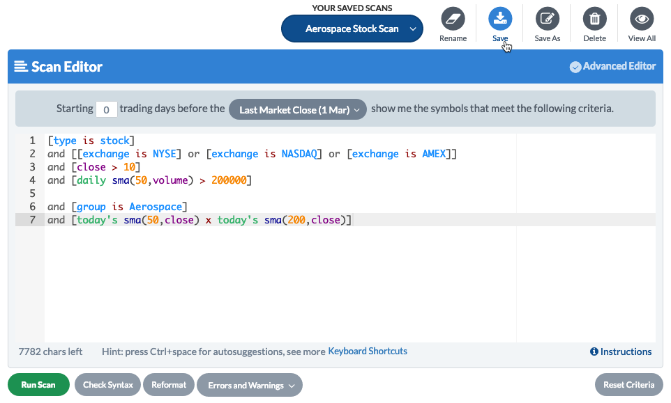 That would take a long time to type in for each and every scan you create. However, there is a workaround that can make it faster and easier to add your default universe-defining criteria to any new scan.&#x20;